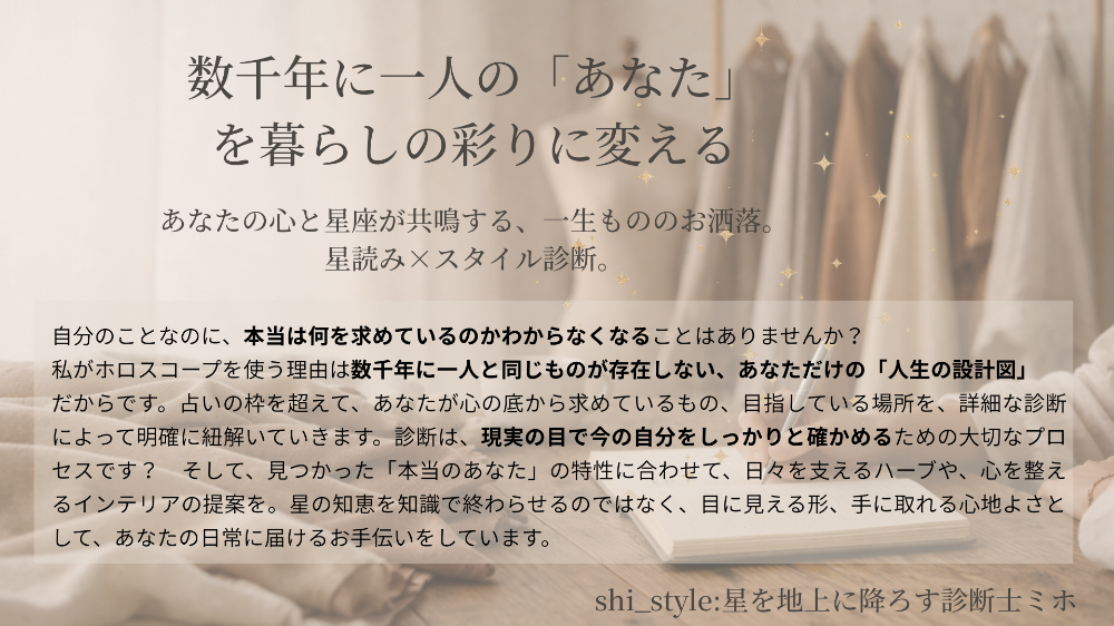 星の示す方向性を、暮らしや装い、日常に落とし込み、無理なく続く心地よさとして届けることを大切にしています。